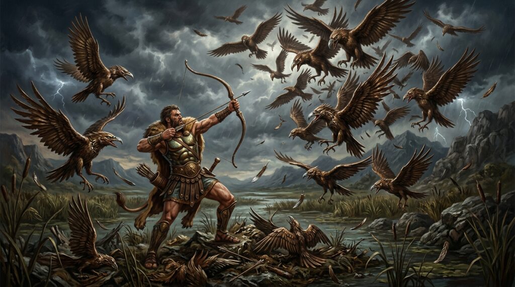 헤라클레스는 아테나의 도움으로 새들을 놀라게 한 뒤 공격해 처리합니다.